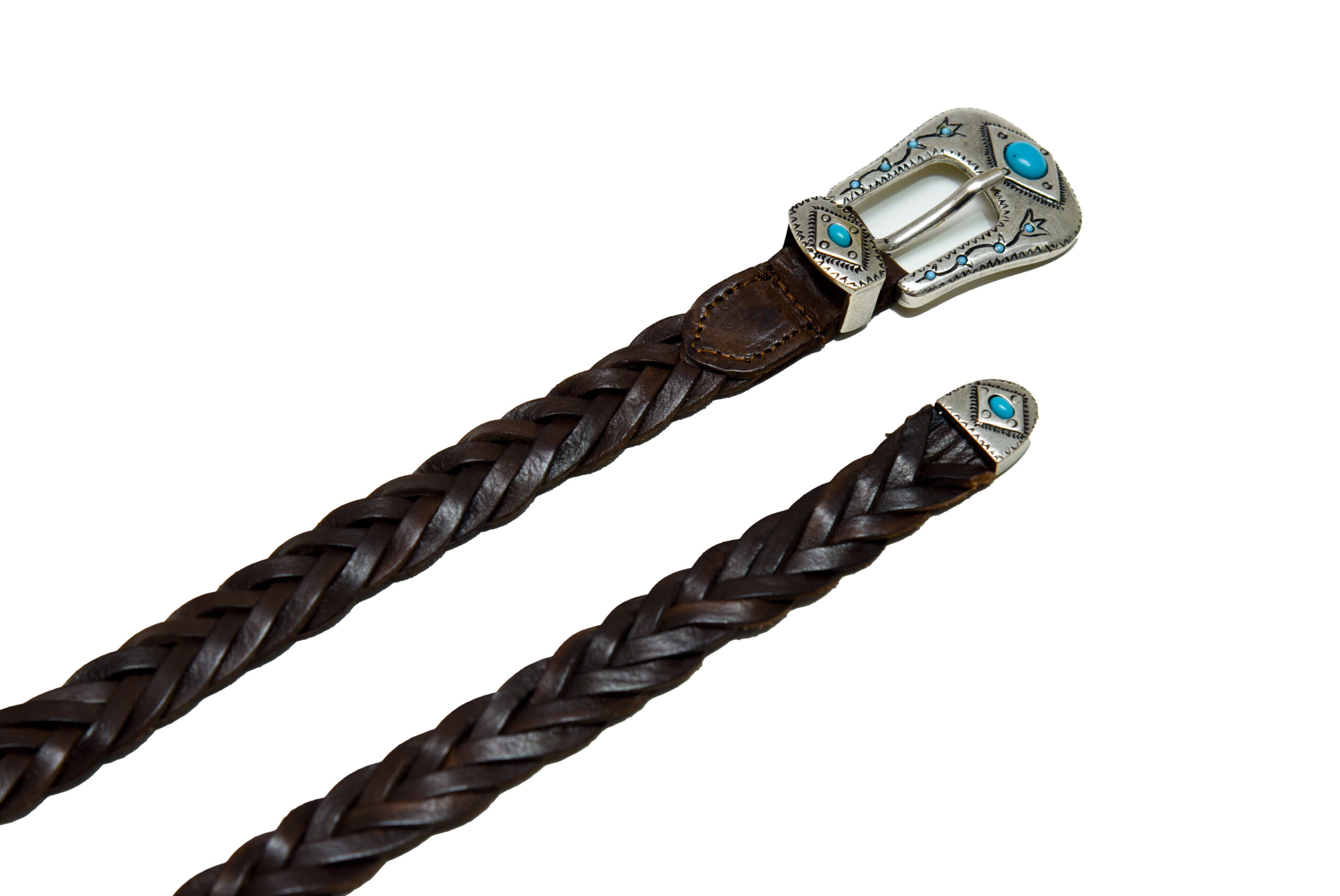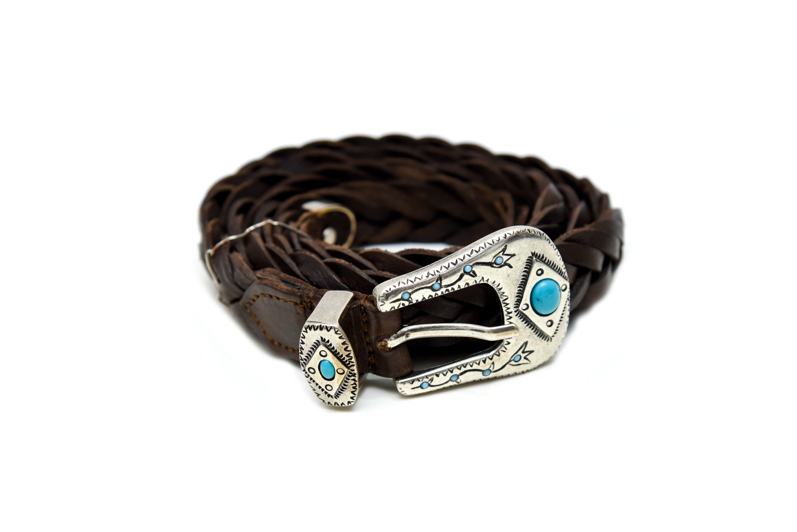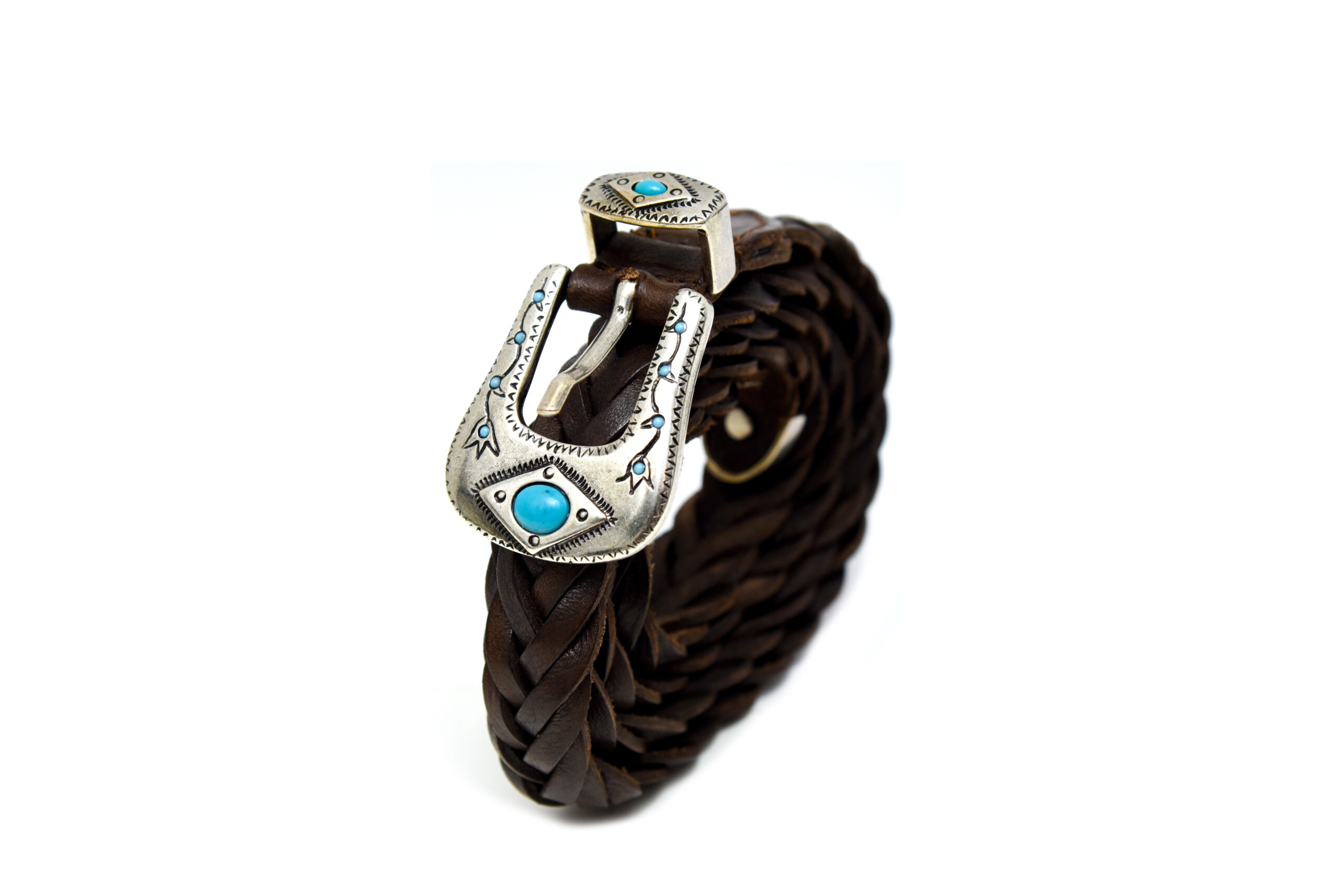 Realizzata a mano in pregiato cuoio bull intrecciata, questa cintura da 2 cm di larghezza presenta un trittico con pietre turchesi composto da fibbia, passante e puntale per un look sofisticato e di classe.