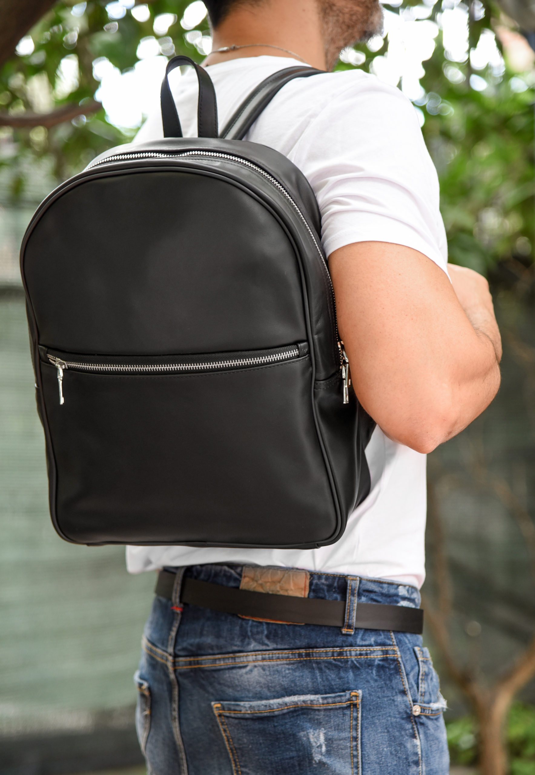 Realizzato a mano con pelle di vitello pregiata, questo zaino presenta tracolle regolabili, una tasca frontale con chiusura a zip e una spaziosa tasca interna con zip.